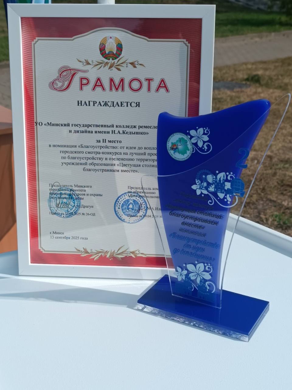 Очередная *ПОБЕДА* учреждения образования В этот праздничный день колледж награждён Грамотой за участие в городском смотра- конкурсе на лучший проект по благоустройству и озеленению территорий учреждений образования «Цветущая столица. Благоустраиваем вместе" в номинации *«БЛАГОУСТРОЙСТВО: ОТ ИДЕИ ДО ВОПЛОЩЕНИЯ"* *У нас достойное 2 место.