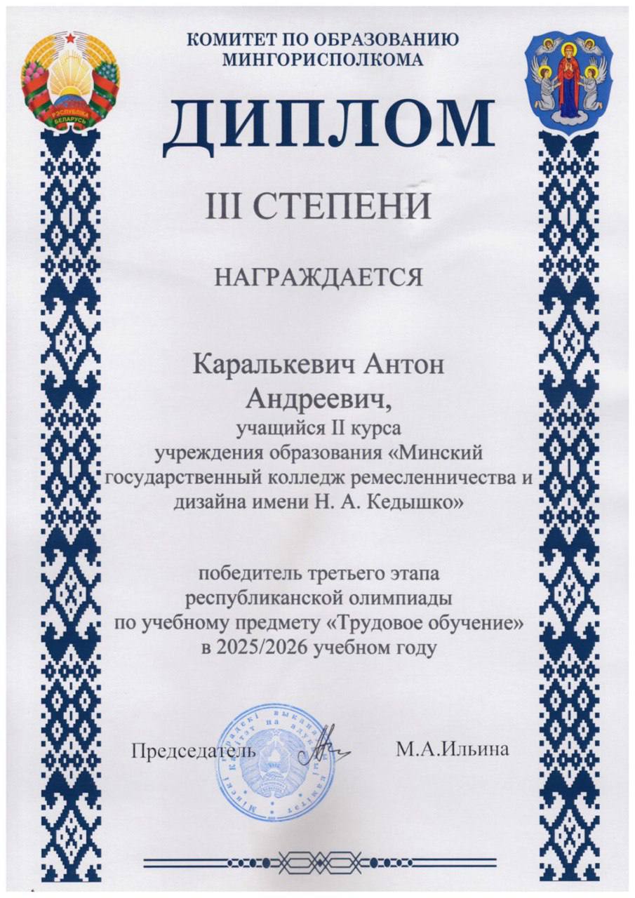 Учащийся нашего колледжа Каралькевич Антон отлично выступил на заключительном этапе республиканской олимпиады по учебному предмету «Трудовое обучение». Его знания, практические навыки и творческий подход были по достоинству оценены компетентным жюри. В результате — заслуженная награда: Диплом III степени! Это достижение — наша общая гордость. Желаем не останавливаться на достигнутом!