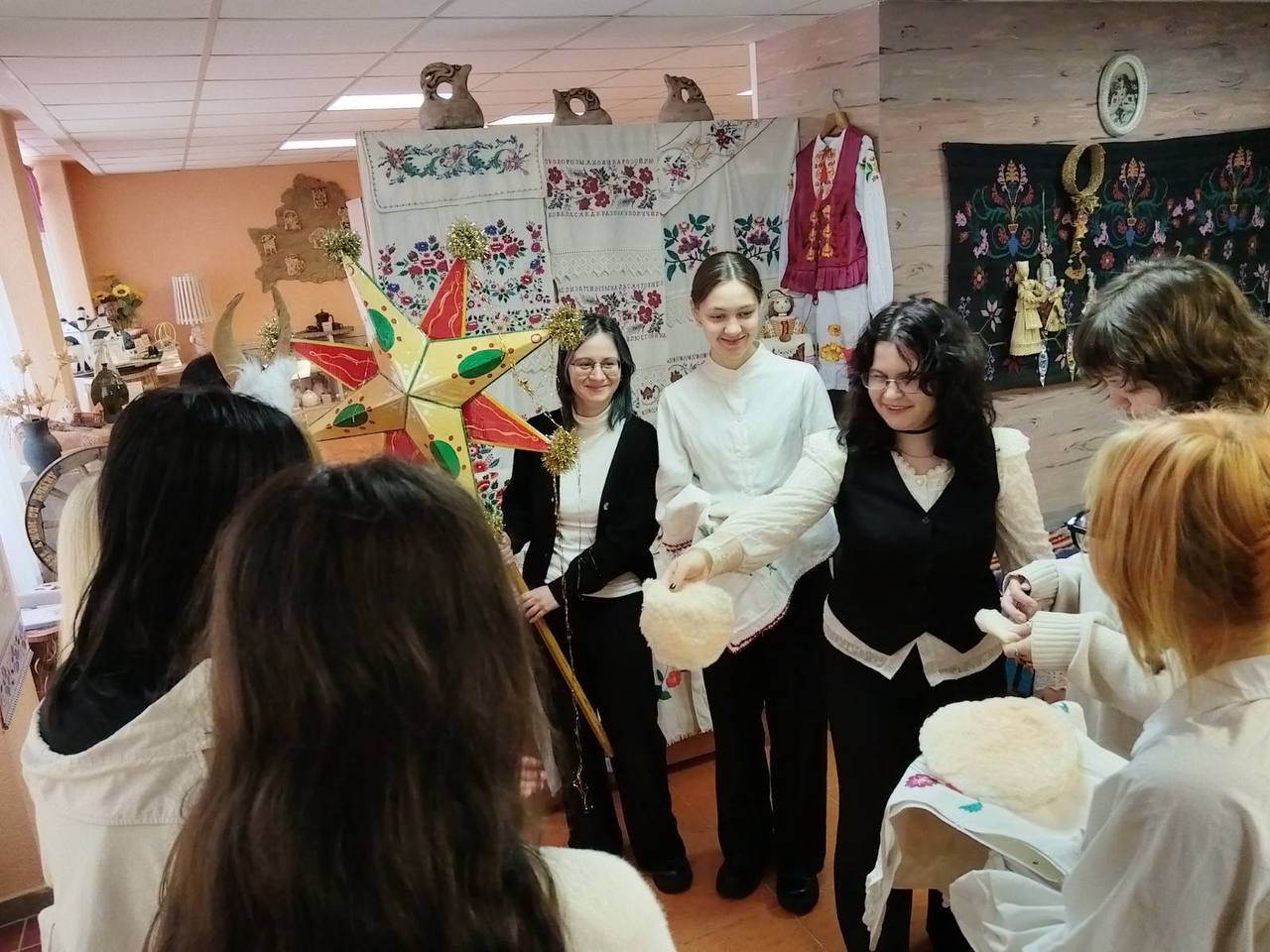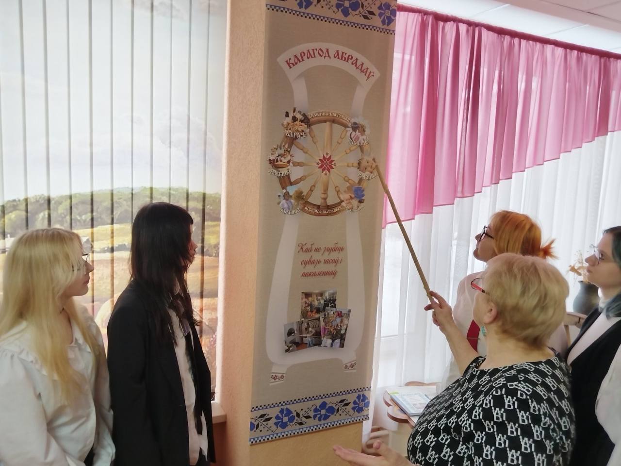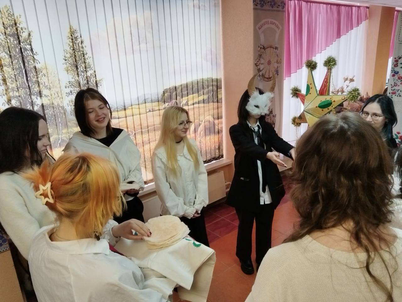 Этнаграфічны музей «На межах часу» абвяшчае старт цыкла экскурсій «Кола года. Каляндарна-абрадавыя традыцыі беларусаў» Жыццё нашых продкаў было цесна звязана са зменай пары года . Гадавое кола праходзіла шлях ад зімовых Каляд да восеньскіх Дажынак . З таямніцамі каляндарна-абрадавых традыцый гадавога кола «Зіма. Каляды ды Масленіца» пазнаёміліся навучэнкі групы 40 , якія зацікавіліся не толькі традыцыямі правядзення зімовых святаў , але і аўтэнтычнымі прадметамі , якія ўяўляюць сабой сімвалы Каляд і Масленіцы.