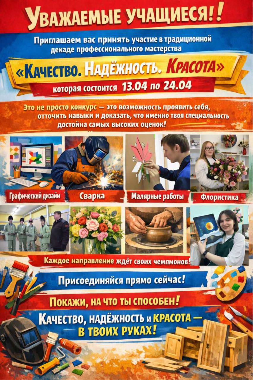 Приглашаем учащихся с 13 по 24 апреля 2026 принять участие в конкурсе профессионального мастерства «Качество. Надёжность. Красота».